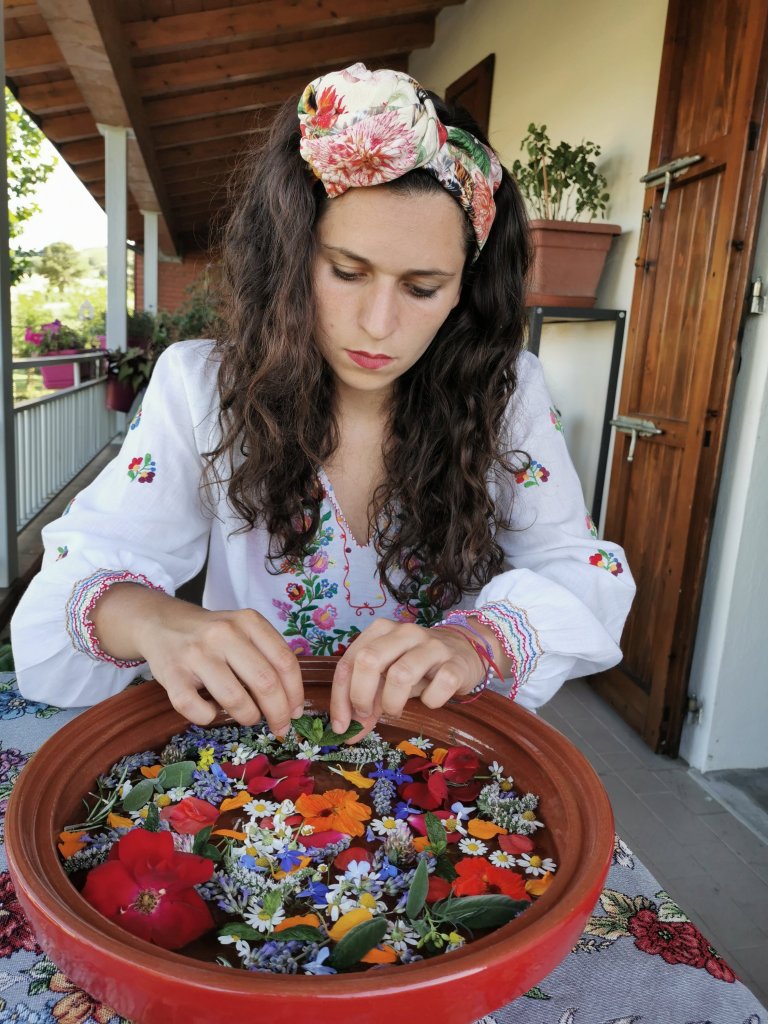 Io ho raccolto le erbe nel campo vicino all’orto. Cesta morbida alla mano e via di Erba medica, papaveri, Camomilla, malva e fiordaliso. Poi sono andata ad attingere alle mie aromatiche, salvia, menta, lavanda, ginestra passando per il giardino dove ho rubato qualche rosa.