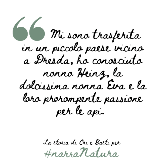 Questa è la storia di Cri e Basti, delle loro api e di una passione più lunga di un viaggio Bergamo-Dresda. La protagonista è Maria Cristina, detta Cri, una ragazza di Bergamo laureata in lingue, una quattr’occhi – dice lei- con la passione per i viaggi che qualche anno fa, tra una packing list, una fattura ed una trasferta, ha incontrato Sebastian detto Basti, addetto alle spedizioni nella stessa azienda per cui Cri lavorava, ma nella sede di Dresda. Si sono subito piaciuti e da allora, nonostante la distanza, non si sono più lasciati. Poi qualche mese fa è arrivata l’occasione, si libera un posto a tempo indeterminato nella sede di Basti e allora Cri prende la palla al balzo, chiude forte gli occhi e si tuffa nel buio. Si trasferisce da lui in un paesino della Sassonia non lontano da Dresda, conosce nonno Heinz e la dolcissima nonna Eva e li scopre la loro passione per l’apicoltura che da molte generazioni scorre pura nelle vene della famiglia. Basti si prende cura delle sue 24 arnie, prepara un miele delizioso, coltiva l’orto e ama raccontare della sua passione a chiunque gliene chieda. Cri prende appunti, fotografa, annota senza ritegno questa passione prorompente. Non è questione di api, né di Hobby, ma della prioritaria necessità di trasmettere i saperi, di riversare entusiasmo sugli altri, di promuovere uno stile di vita che dai piedi si aggrappa alla terra, radicalmente. Cri e Basti hanno tanti progetti per il futuro: vorrebbero aumentare le arnie , migliorare la loro immagine ( hanno da poco mandato in stampa delle nuove etichette fichissime) , creare prodotti come candele , sapone , propoli e chissà magari trasformare tutto questo in fonte di sostentamento. Cri, in particolare , vorrebbe incanalare la sua creatività in un progetto digitale per raccontare questo mondo che l’ha rapita e soddisfare la curiosità di tanti amici e conoscenti che nonostante gli oltre 1000 km di distanza la seguono con vivacissimo interesse. E così tra interminabili discorsi in inglese (naturalmente Cri è laureata in lingue, ma ironia della sorte del tedesco neanche l’ombra), esclamazione in bergamasco , fragole e insalate Cri e Basti coltivano la passione per le api e – già che ci sono – anche una bella storia d’amore .