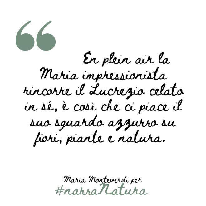 Maria dipinge la realtà attraverso piante, fiori, frutti e ortaggi autoctoni della nostra tradizione e attraverso quelli si propone il preciso obiettivo di creare ambientazioni il più possibile fedeli a quel preciso periodo dell’anno. En plein air la Maria impressionista rincorre il Lucrezio celato in sé, è così che ci piace il suo sguardo azzurro sulla natura.
