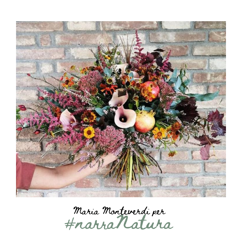 Siamo da poco in autunno e le nuances in dinamica trasformazione scandiscono i giorni. Gli aranci e i bordeaux contrastano senza ritegno muri grigi e cieli ora tersi ora plumbei e Maria con quel volto poetico alla Jeanne Hebuterne, la donna dagli occhi azzurri, ne coglie ogni sfumatura attraverso le sue composizioni floreali.