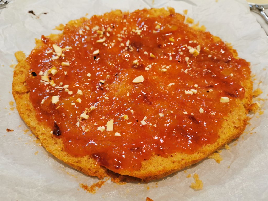 Una volta sfornata la torta lasciatela raffreddare e in seguito tagliatela orizzontalmente a metà e farcitela con la marmellata di Castagne e, se volete, con qualche pezzo di nocciola. La farcitura è una mia modifica all’originale, non si sa mai che perda qualche etto.