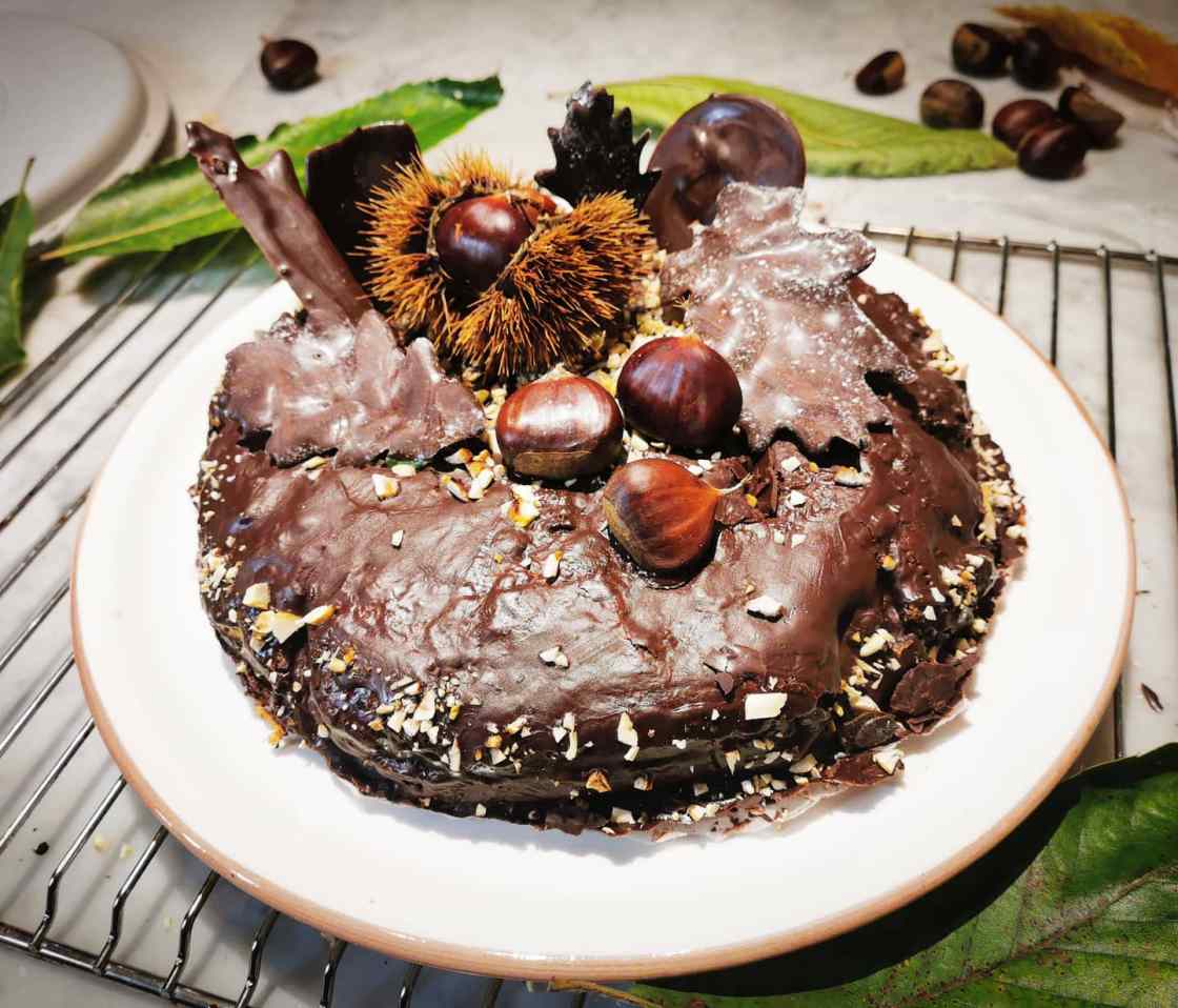 Ponete quindi la torta su una gratella da cucina e ricopritela di glassa. Lasciate raffreddare e decorate la con Castagne intere e pezzi di castagna. Anche qualche foglia di cioccolato non ci sta affatto male.