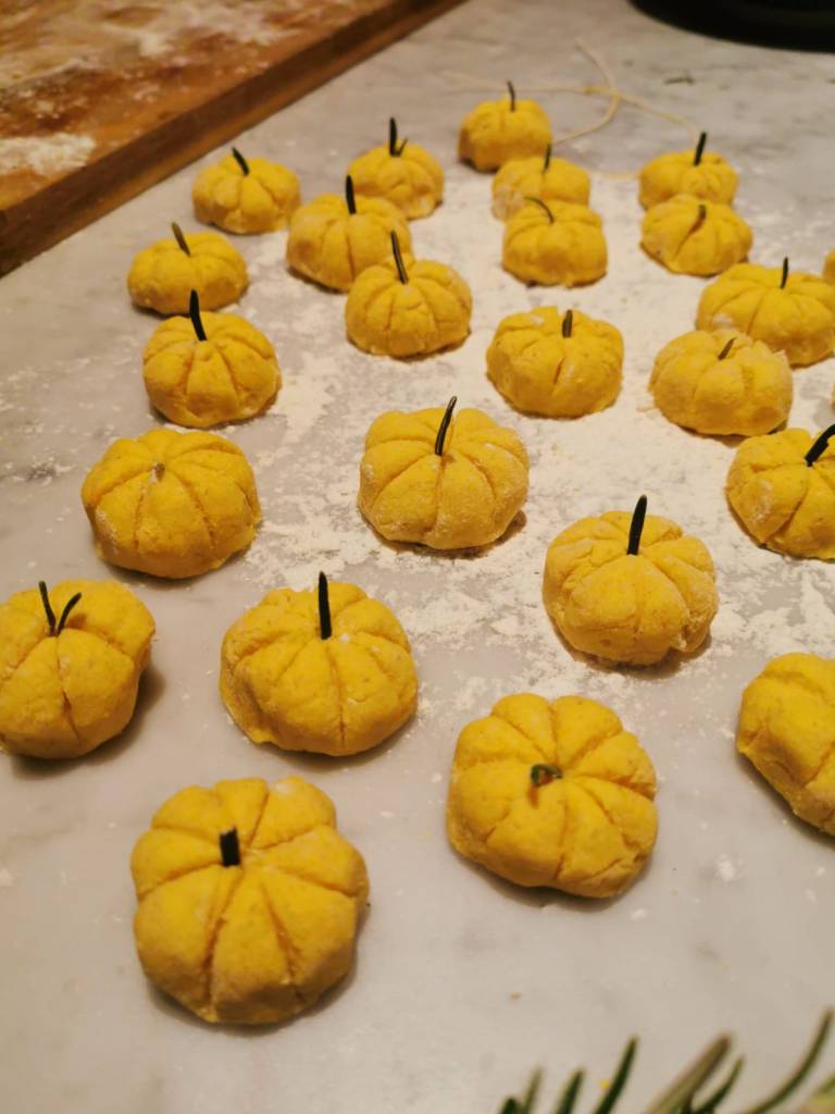4- A questo punto potrete ricavare delle piccola palline dall’impasto delle piccole palline di circa 3/4 cm aiutandovi con uno spago disegnare le pieghe della zucca.