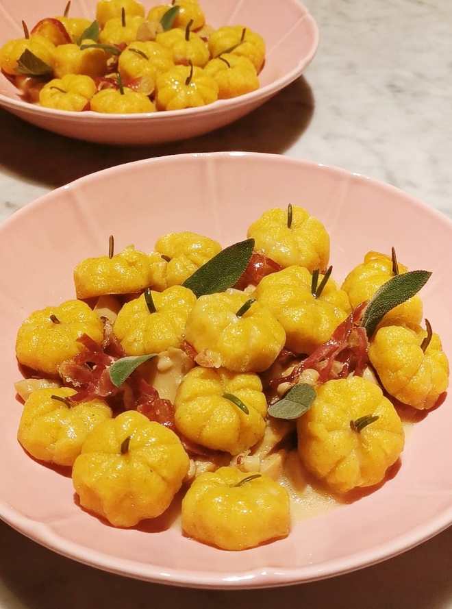 6- Infine bollite gli gnocchi e ripassateli in una padella antiaderente con un filo d’olio o burro e qualche foglia di salvia. Io ho unito anche qualche listarella di prosciutto crudo di Parma così da insaporire l’olio. Il prosciutto friggendosi diventa croccante, perfetto per decorare il piatto.